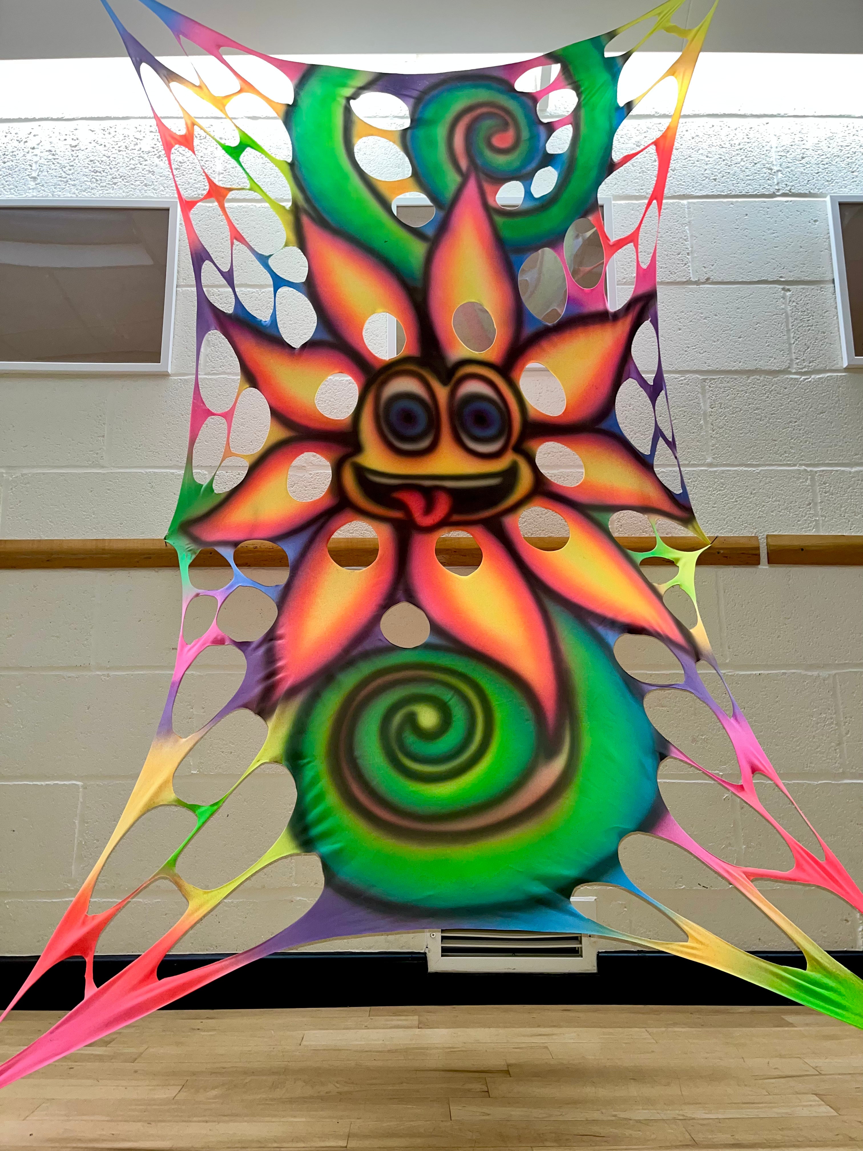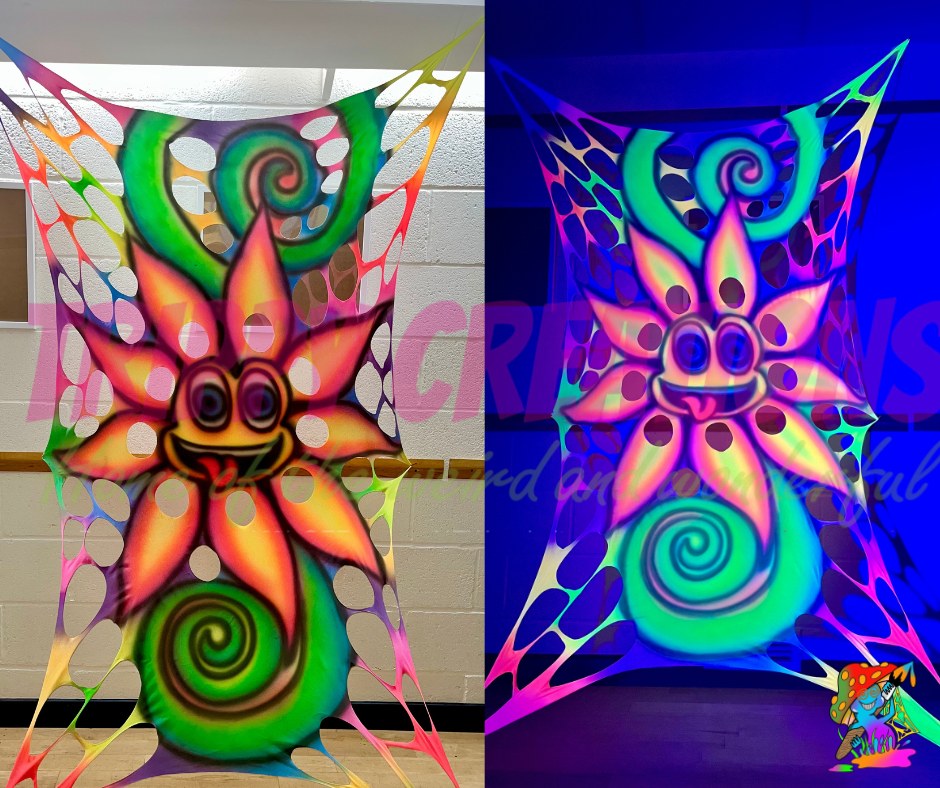 Bring trippy, psychedelic vibes to your space with this custom-made UV wall hanging! Featuring a cheeky flower face with its tongue out, each piece is hand airbrushed in vibrant neon colors that glow under blacklight, making it a standout decor piece for anyone into funky man cave decor, trippy room setups, or bold party installations.