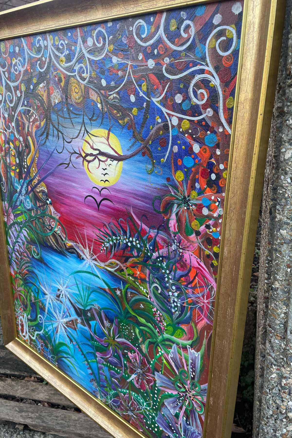 Have you ever lost yourself to the beauty around you whilst on a walk? Well The Twisted Moon Tree was created out of love for the world around us. It enhances, captures and exaggerates a scene I stumbled on where I paused for a while and let my imagination run wild. The personified tree and the glistening lake adds elements of magic to this enchanting location. I believe it’s the perfect woodland fairy art for lovers of the weird and wonderful.