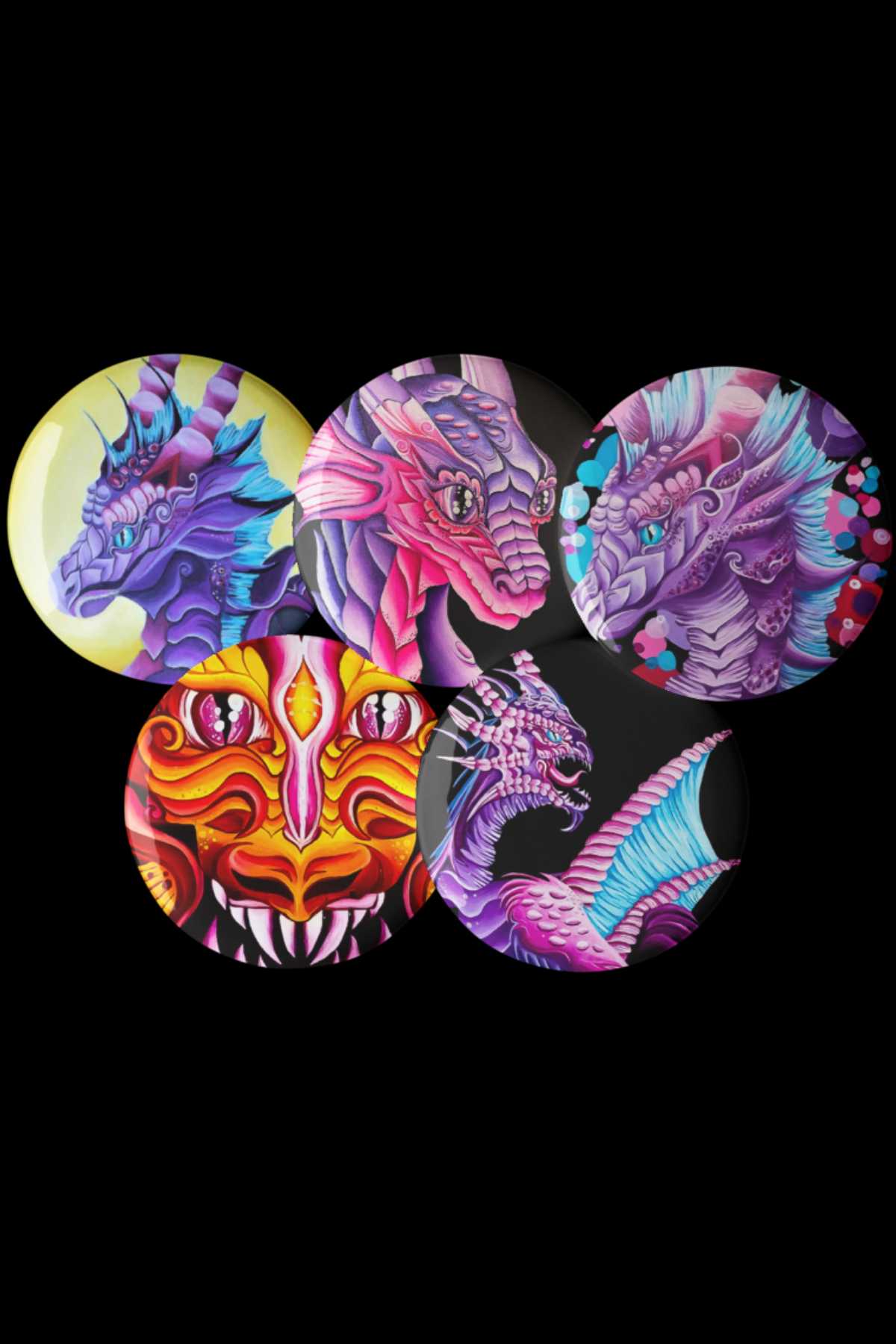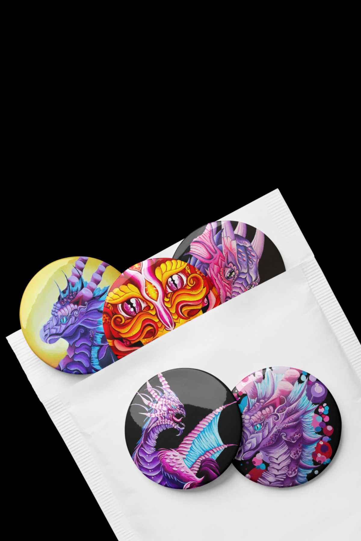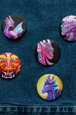 Ready to take your dragon obsession to the next level? Equip yourself with these five fierce dragon buttons and show the world who's really boss! Transform your look with a mythical spin - add these mythical creatures to your bag, coat and more! Nothing says "badass" like a pack of dragon badges!