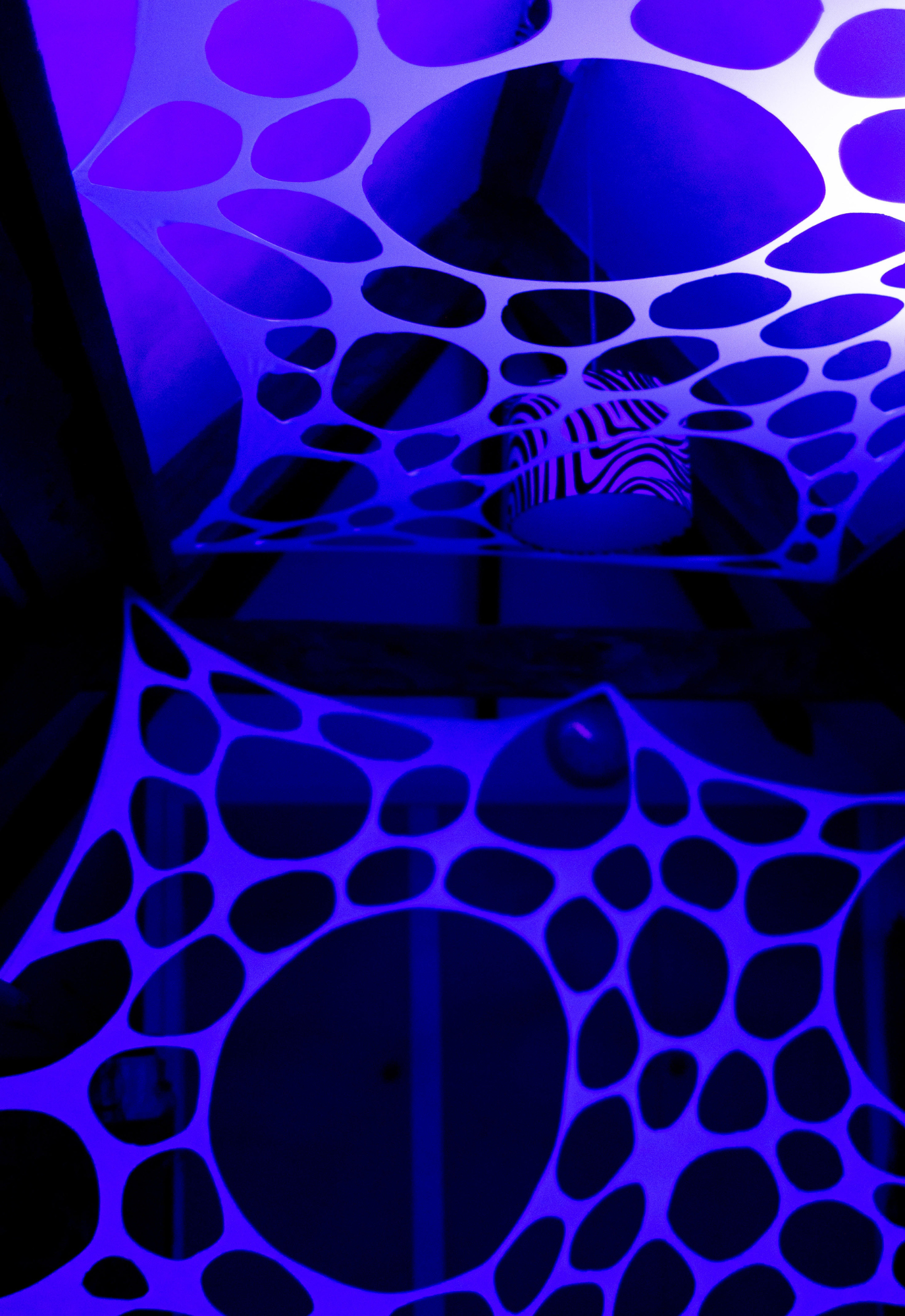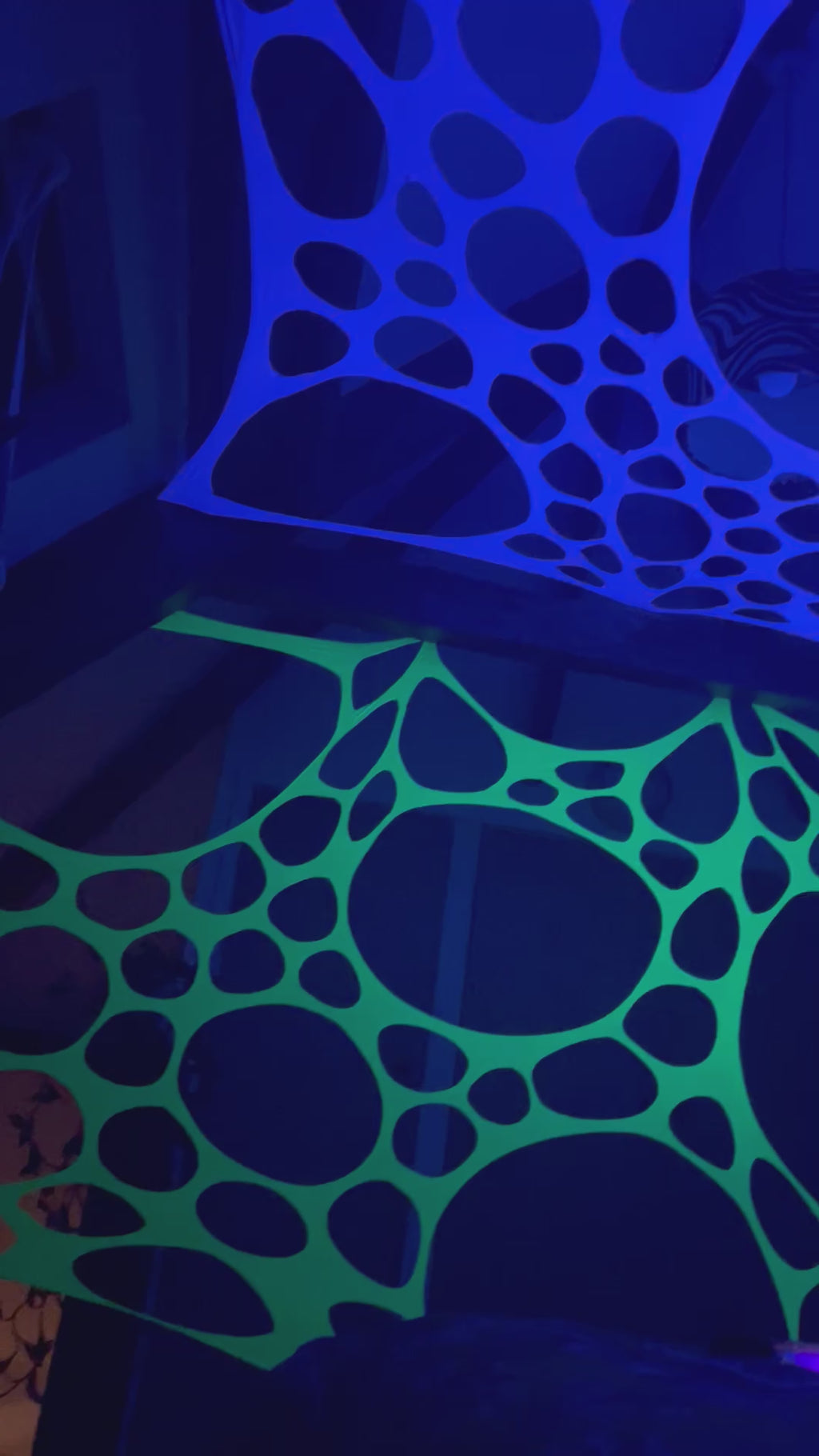 The webs are made using UV reactive fibres. Under UV or blacklight they glow brightly, creating that high impact fluorescent effect. In normal lighting they still look great, but UV lighting really brings them to life.