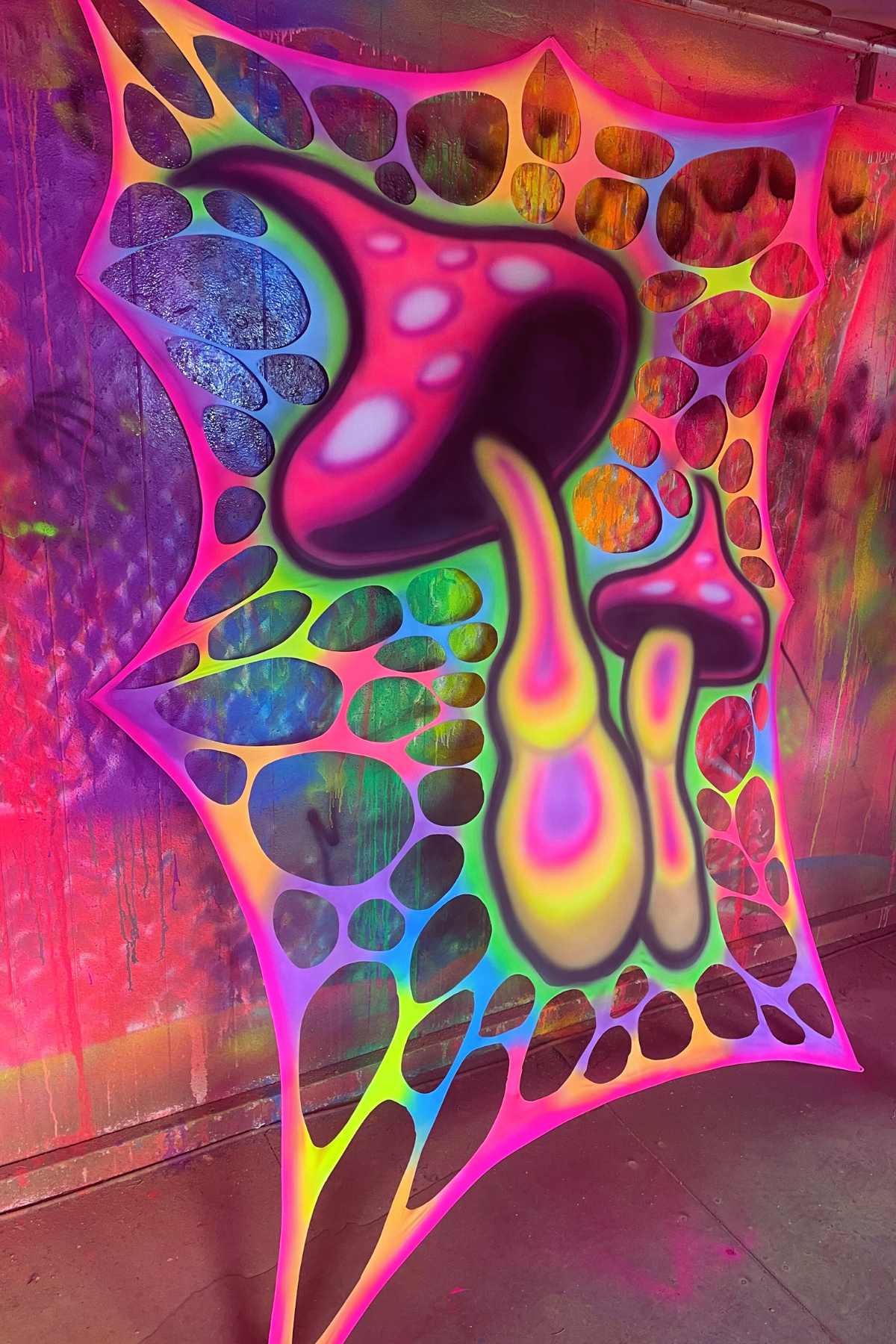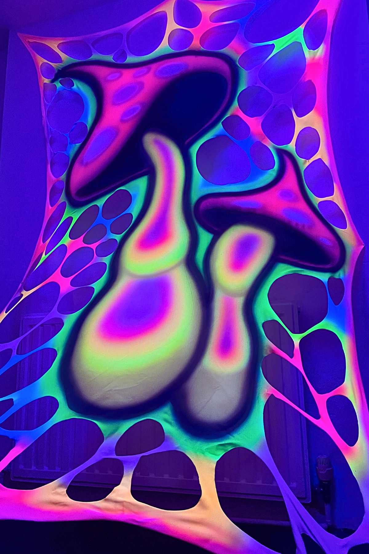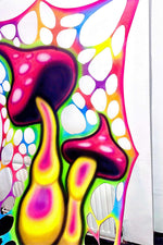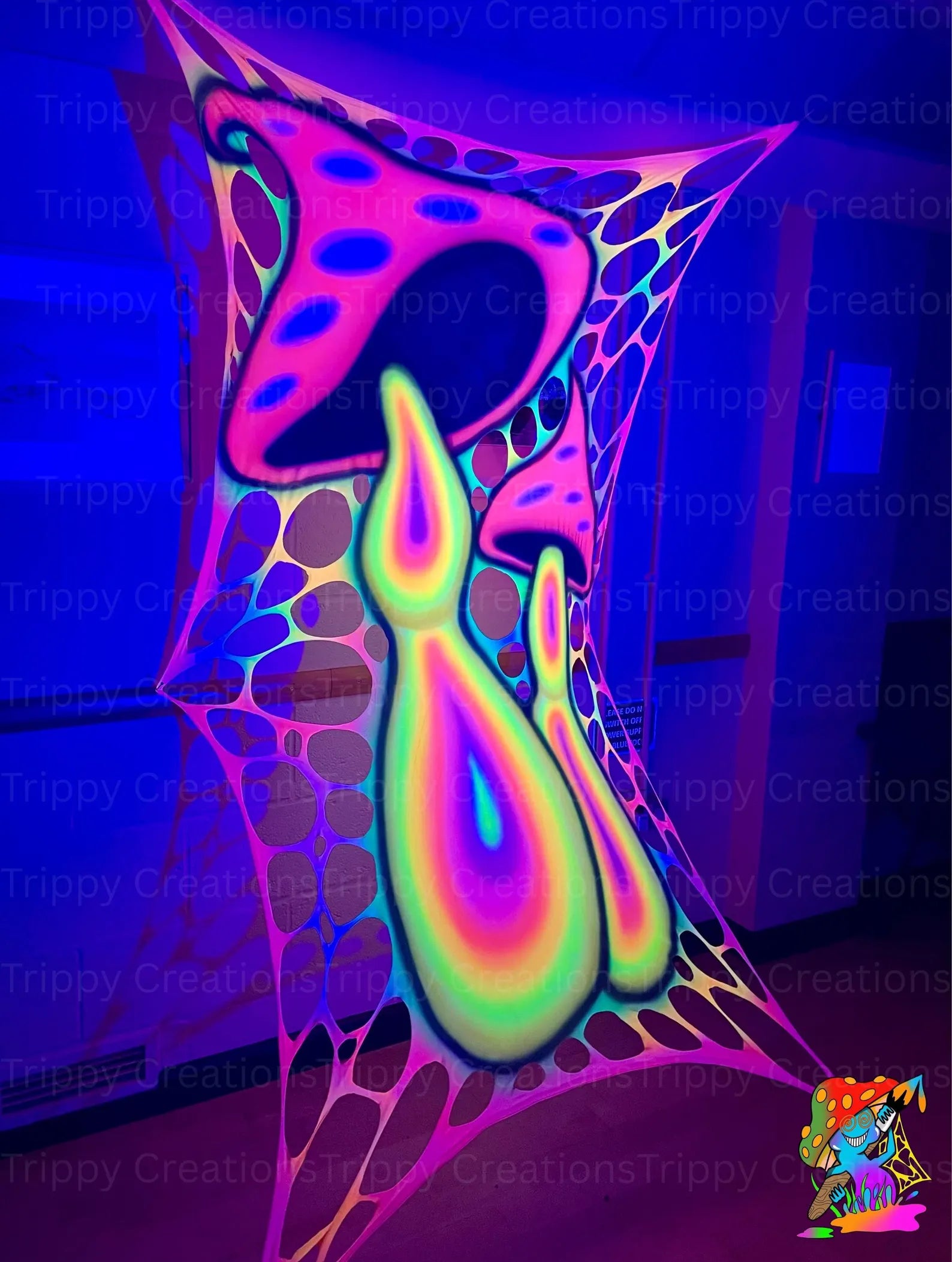 Our brand new, made to order psychedelic mushroom wall hangings are here to spice up your surroundings and with ease. All you need to do is simply stretch it out as shown on the images and lightly hammer into it with small tacs. OR... if you would rather cable-tie into position then simply pop your cable-ties through the polka dots and stretch out that way. How you install is up to you, all we say is to make sure you're stretching it out to the max to ensure full effect.