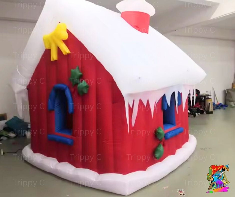 Inflatable Christmas-themed house with red roof, white trim, and green door in an urban setting.