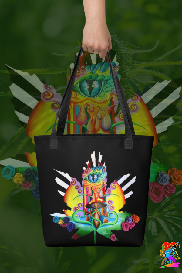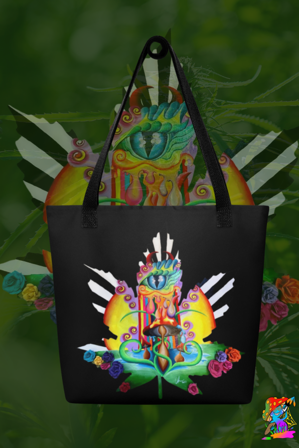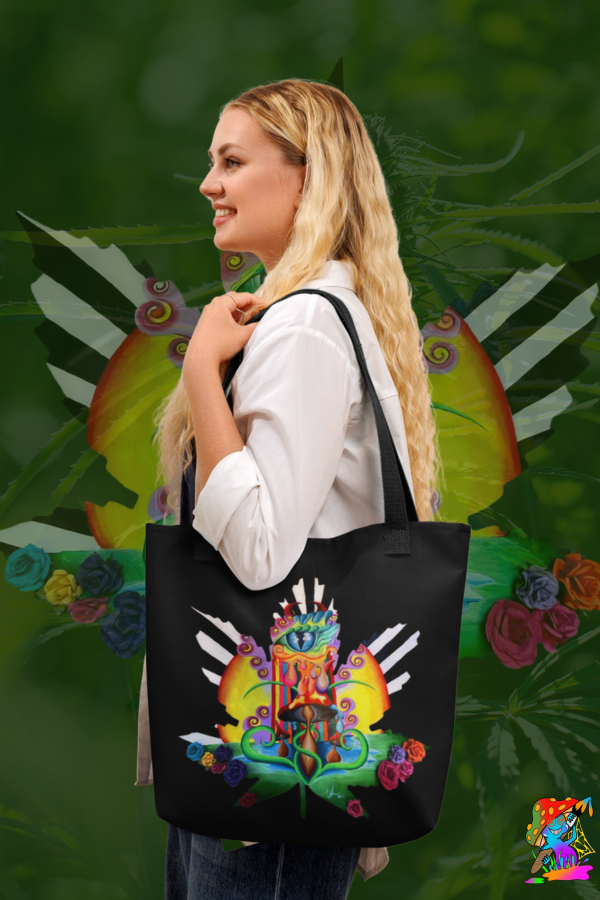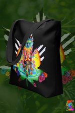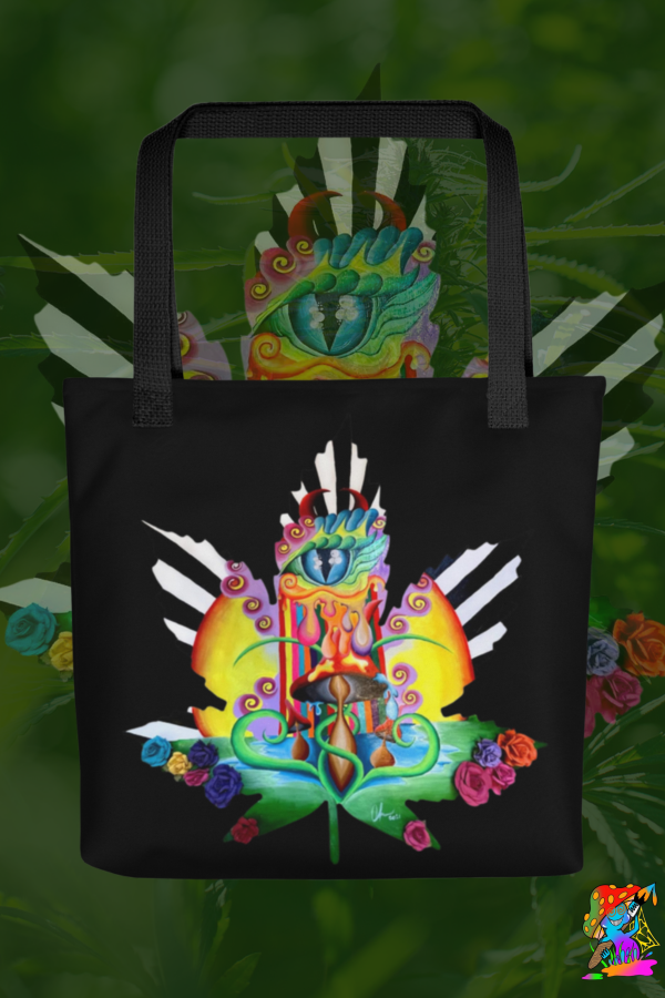 Make a bold statement while carrying everything you need with our psychedelic hemp leaf tote bag.