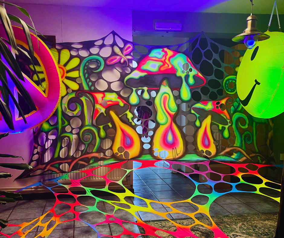 - 1 x 3m UV Mushroom Web – Bring some groovy mushroom vibes into the mix with this unique UV web which has been hand sprayed