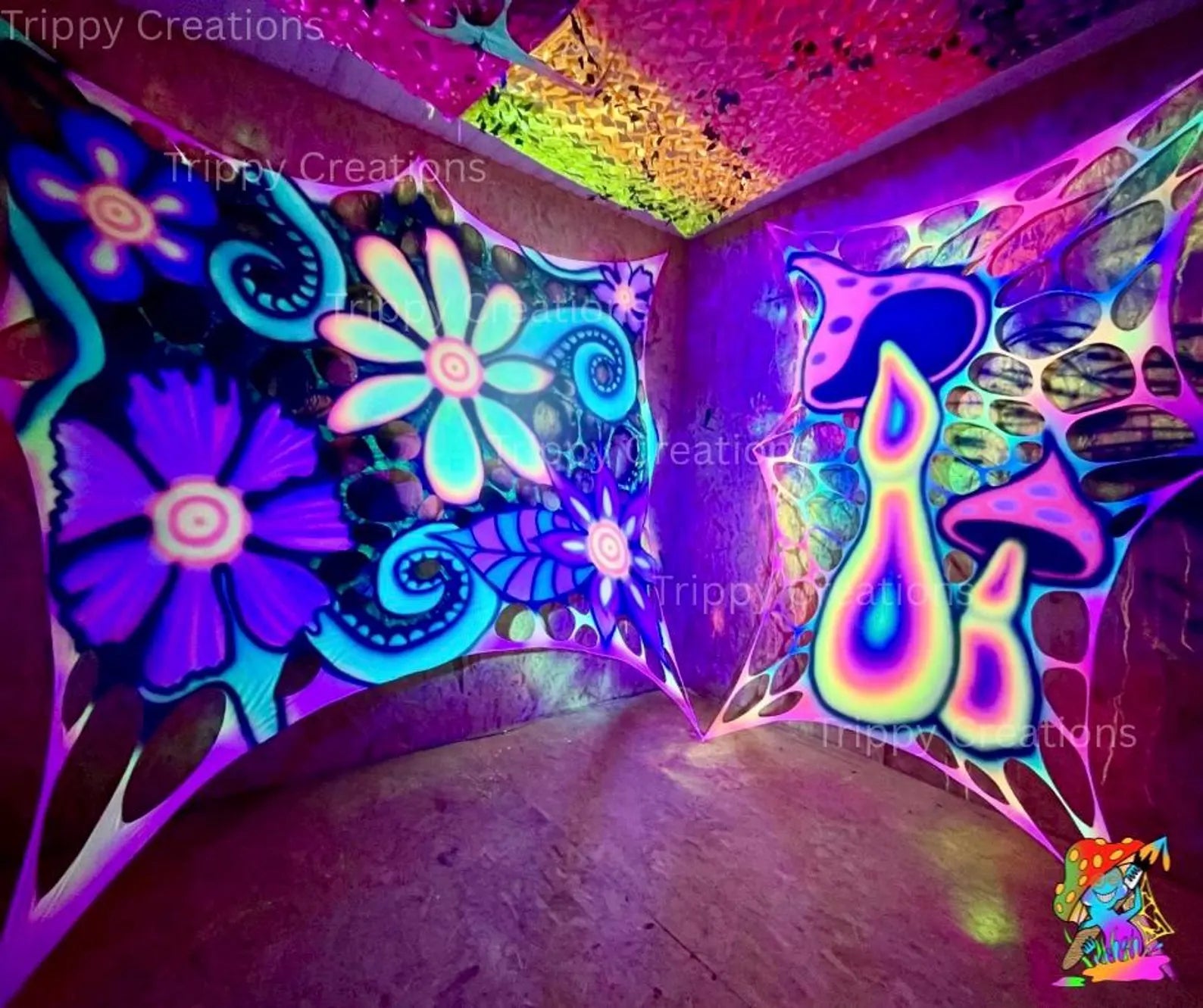 Trippy UV-reactive flower-power wall hanging for psychedelic events