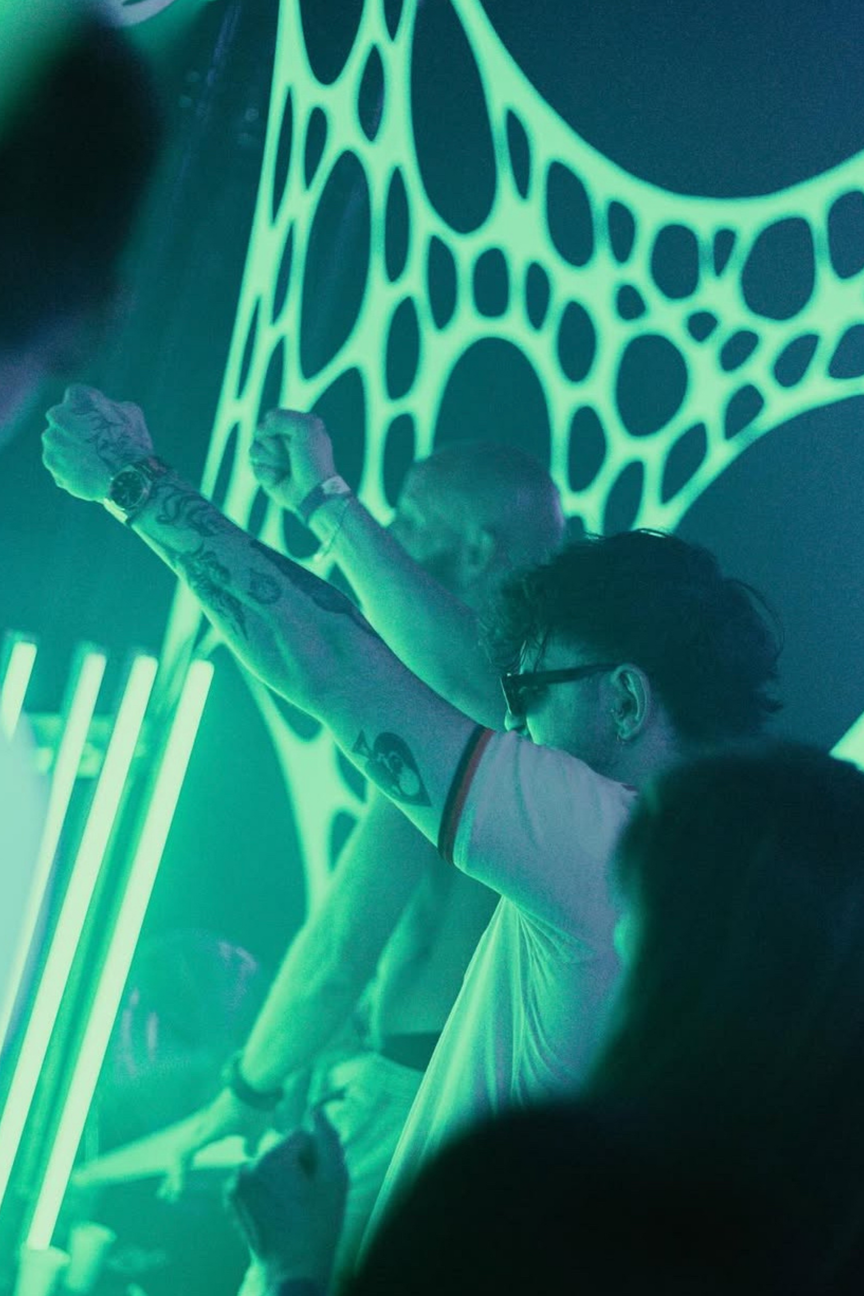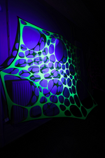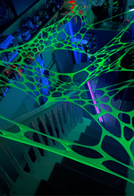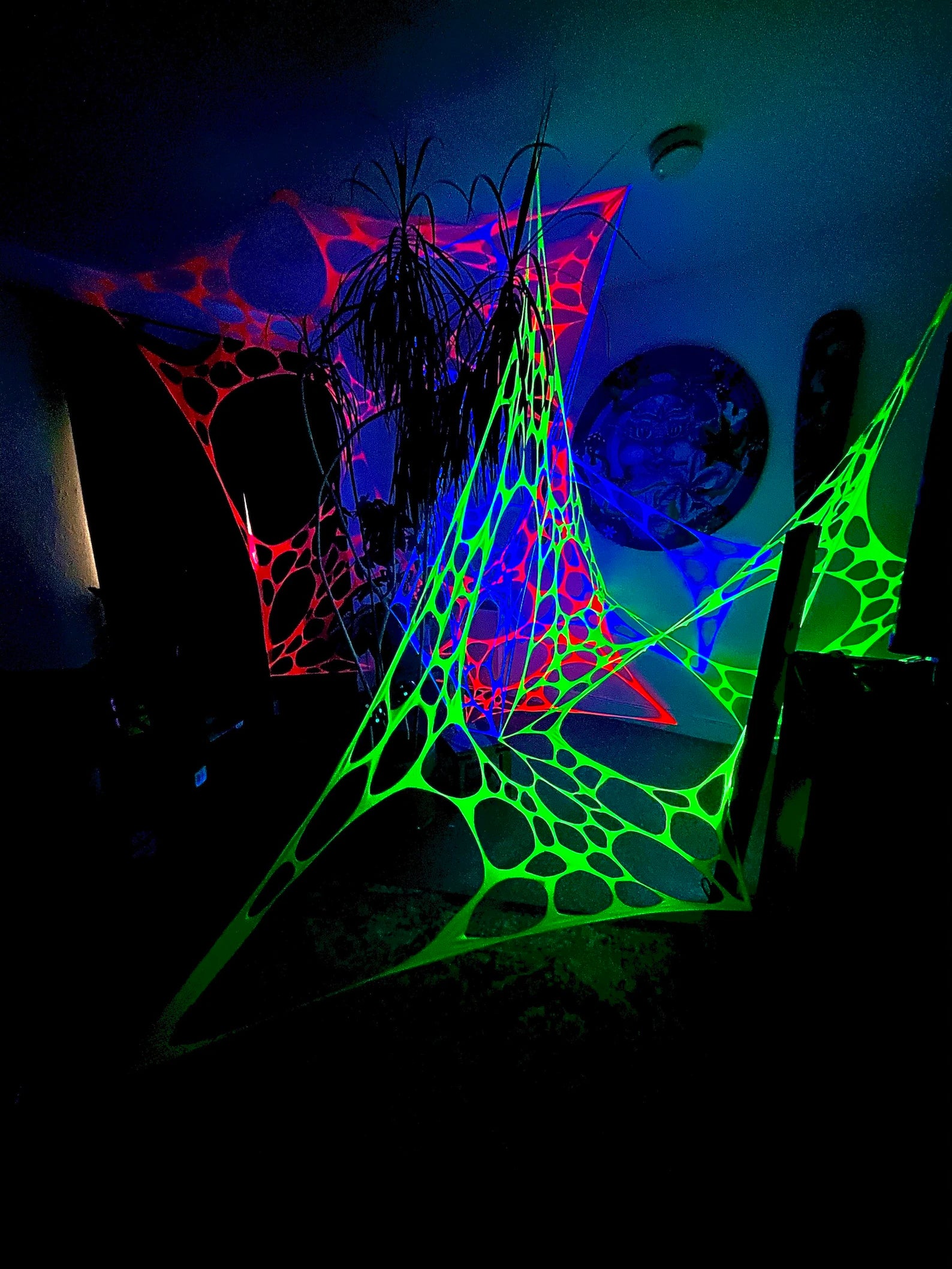 The webs are made using UV reactive fibres. Under UV or blacklight they glow brightly, creating that high impact fluorescent effect. In normal lighting they still look great, but UV lighting really brings them to life.