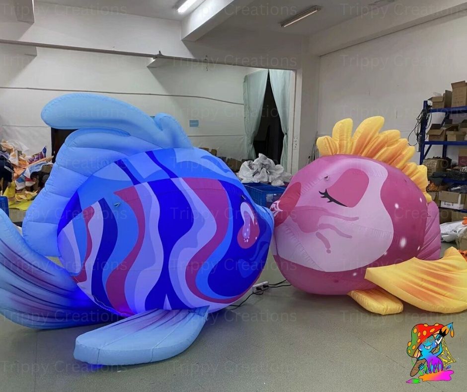 Add a splash of playfulness to your underwater event with our adorable Kissing Fish Inflatable. Featuring two colourful fish – one blue, one pink – sharing a sweet kiss, this prop brings a heartwarming twist to any under the sea-themed party, kids’ event, or festival installation.