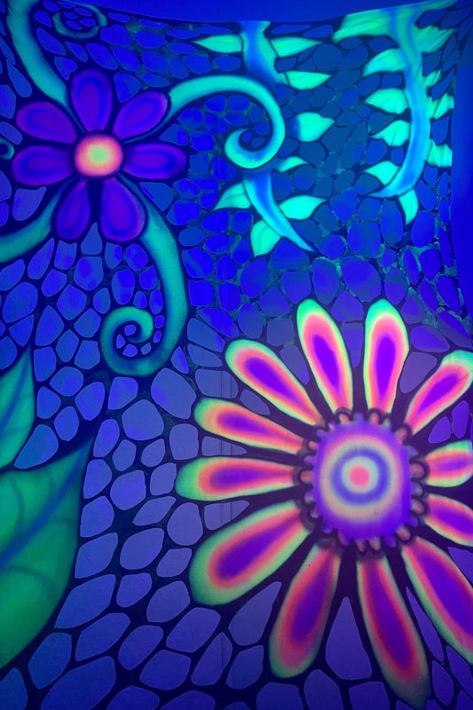 Trippy UV-reactive flower-power wall hanging for psychedelic events