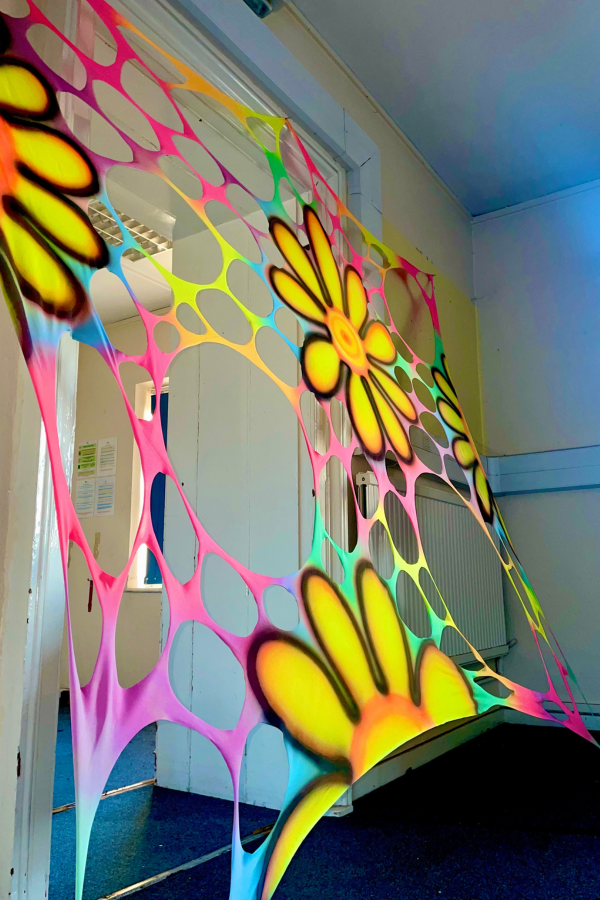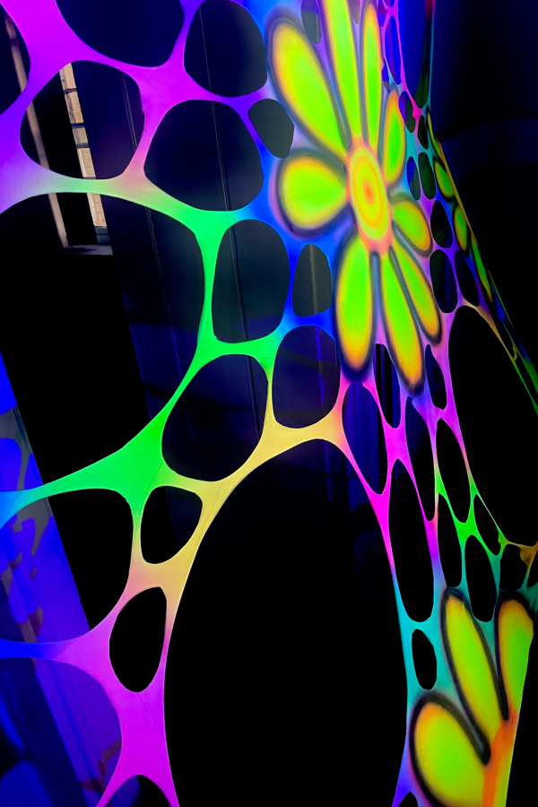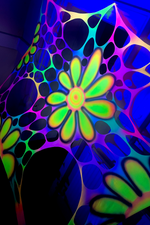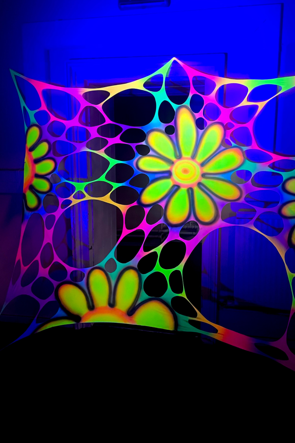 Watch as this multi-colour daisy web bursts into vibrant fluorescence under blacklight, turning ceilings and walls into a psychedelic dreamscape. Whether you're decking out a festival tent, club, mancave, or immersive art space, this stretch webbing is your go-to for jaw-dropping visuals.