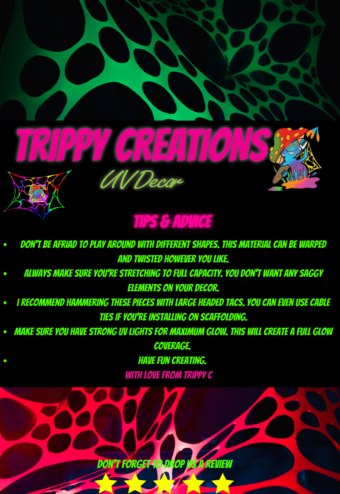 Are you bored of hosting events where the decor doesn’t have much impact ? Do you want to maximise the wow factor of underground events / birthdays and more ? Well our made to order, ultra violet, hand cut stretch decor pieces will certainly give it a kick!