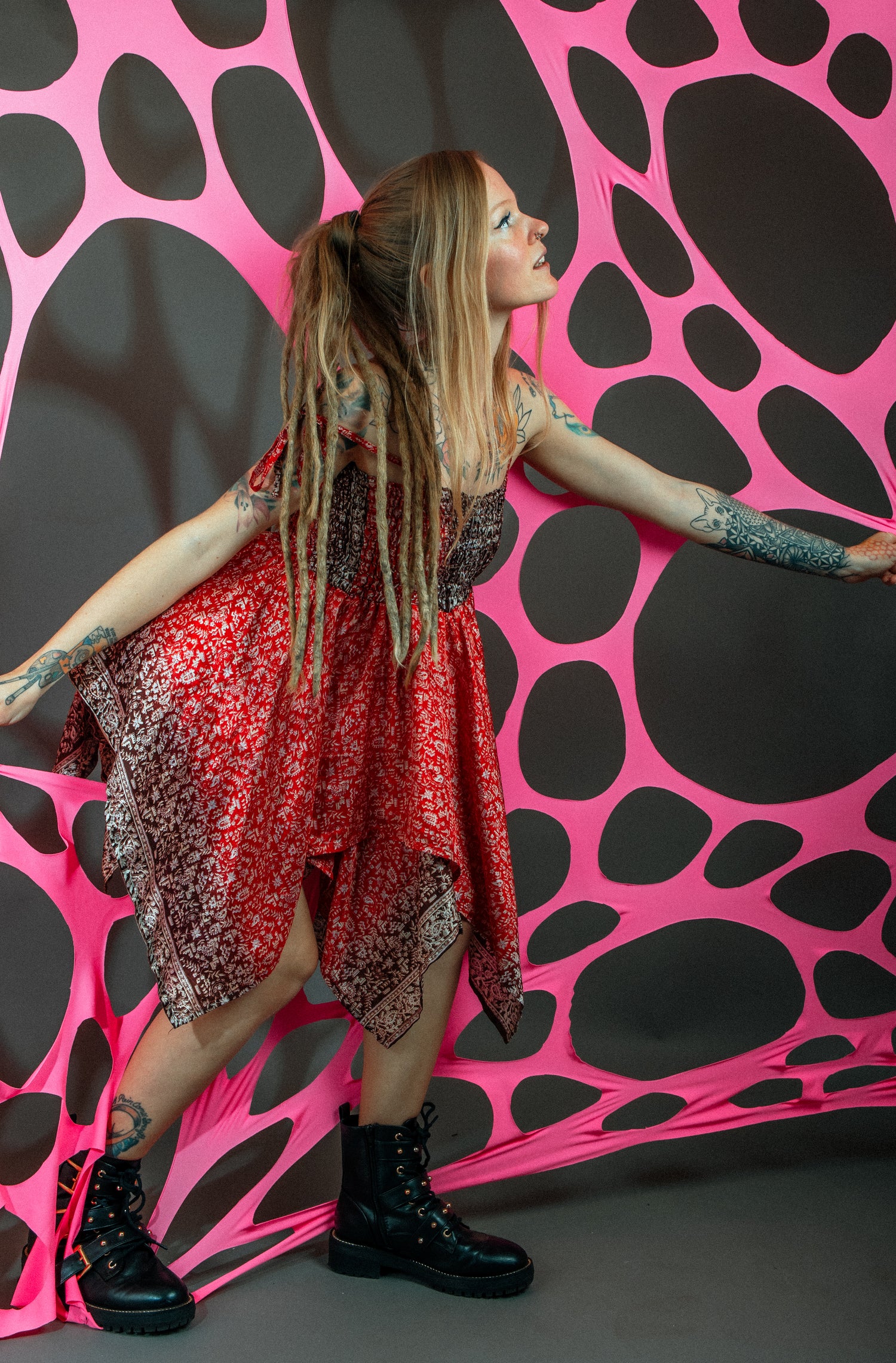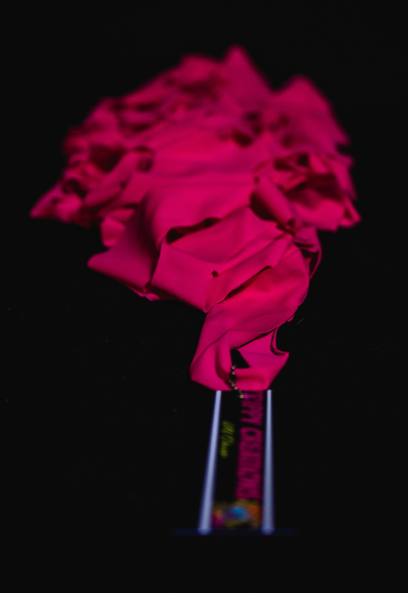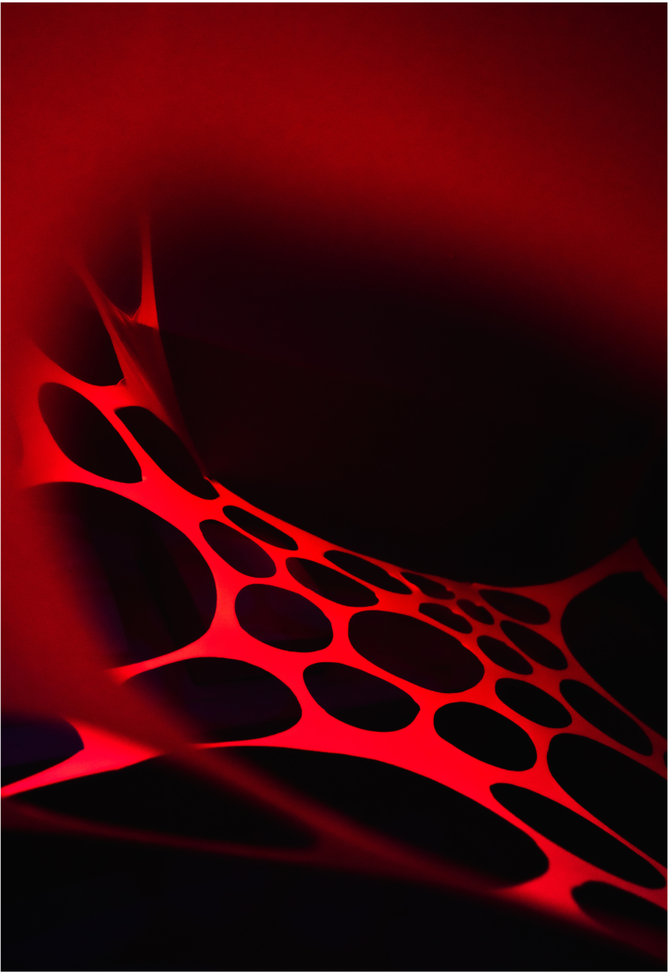 A twin set of 3 m UV reactive webs in punchy pink and warm red under UV light.